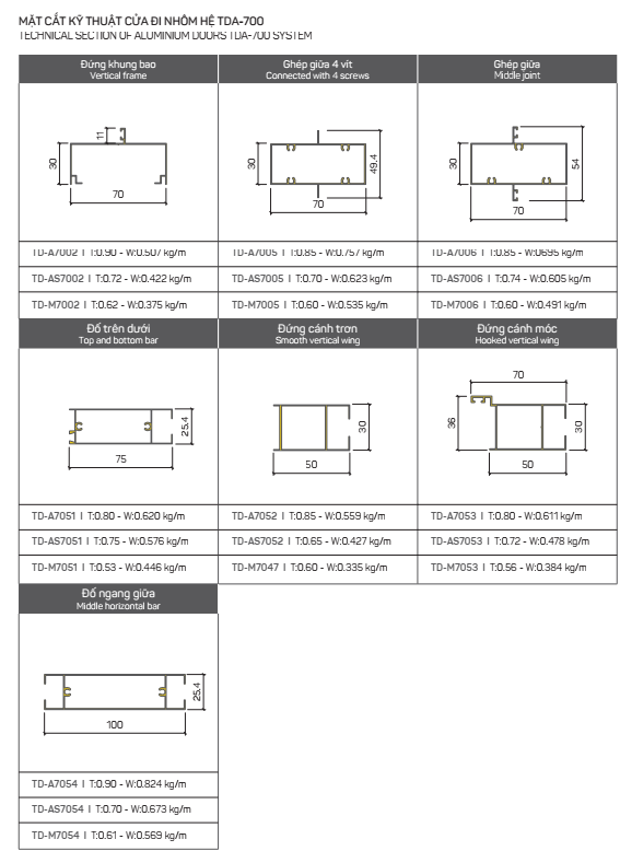 Thông thường mẫu Hệ TDA 700 sở hữu thanh nhôm có vai trò tương tự như thanh dầm. Giới hạn đoạn võng mà sản phẩm được quy định là 700mm. Loại vật liệu này được sử dụng phổ biến để sản xuất các mẫu cửa nhôm hệ 700 loại cửa đi và cửa sổ.