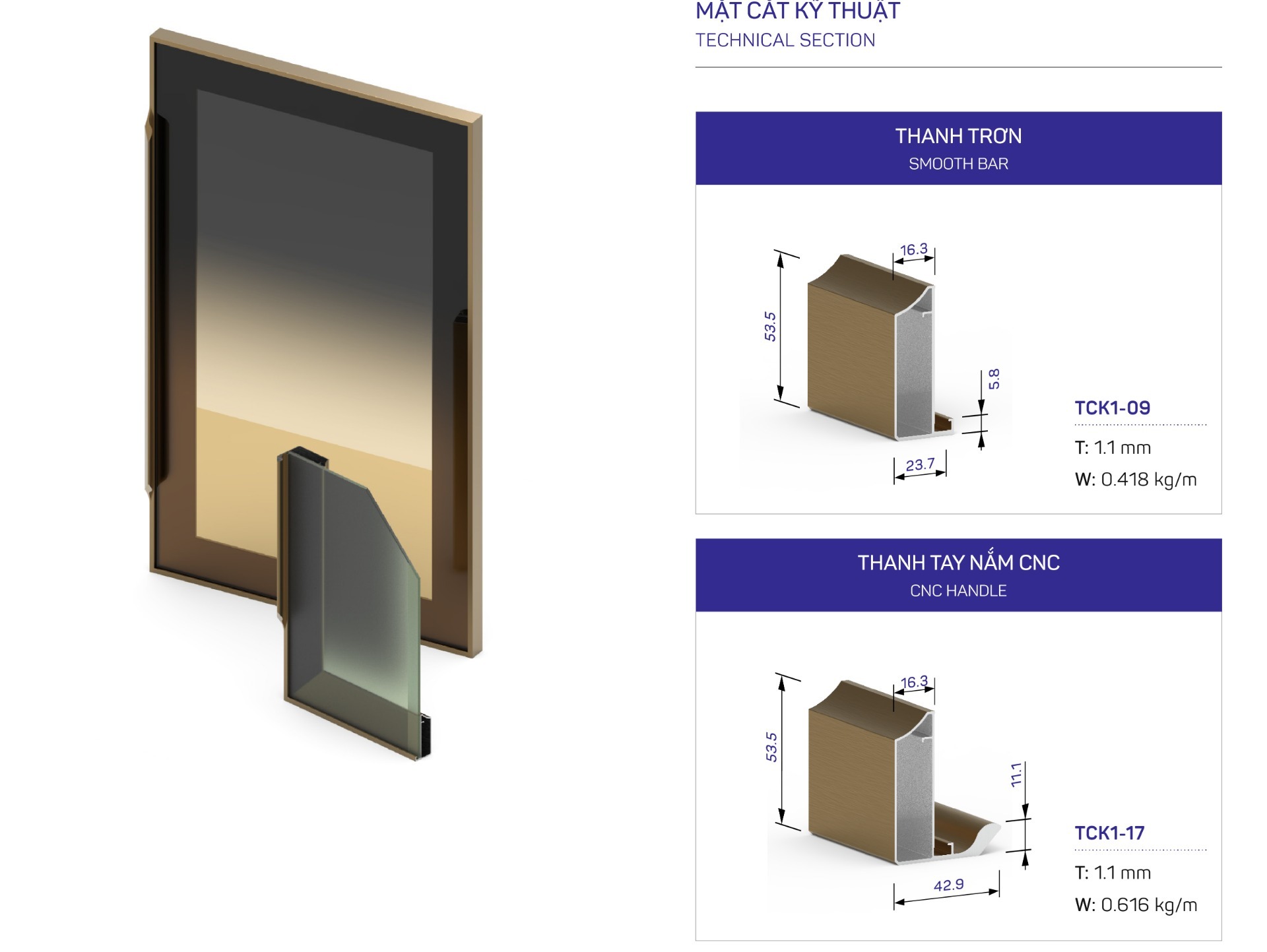 Có thể linh hoạt kết hợp với nhiều loại kính và vật liệu khác nhau, tạo ra các biến thể thiết kế phong phú. Điều này giúp nó phù hợp cho nhiều ứng dụng khác nhau như tủ rượu, tủ trưng bày, tủ quần áo, tủ bếp,....