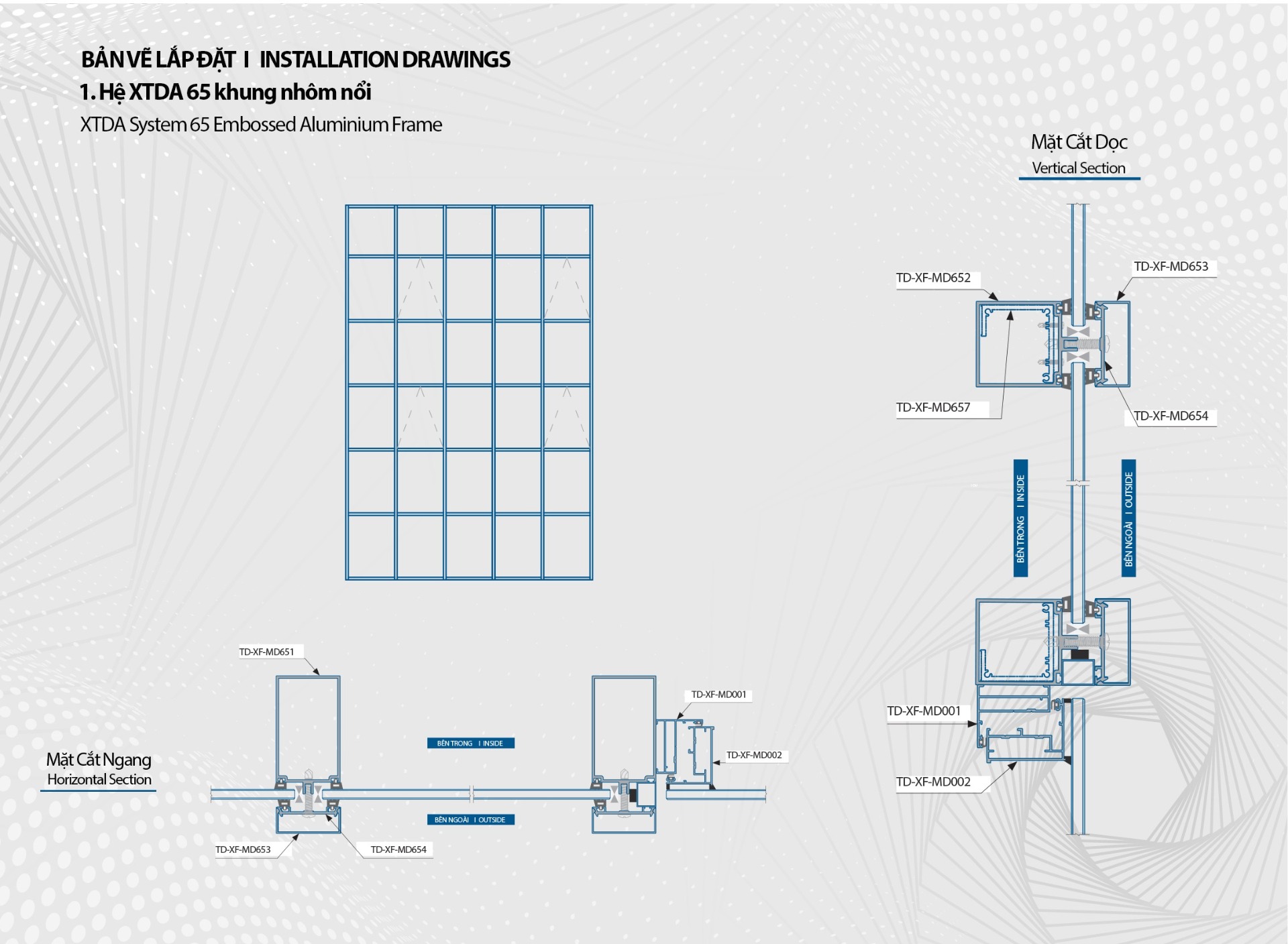 Mặt cắt của hệ nhôm XTDA 65 có bề rộng lớn nhất là 65mm nên nó được đặt tên theo bề rộng của nhôm. Nhôm hệ 65 có 2 loại chủ yếu là hệ vách mặt dựng giấu đố và vách mặt dựng lộ đố. Độ dày chủ yếu của hệ 65 từ 2.0mm-3.5mm. Mặt dựng hệ 65 khung nhôm nổi với kết cấu lộ đố tạo nên vẻ ngoài chắc chắn.