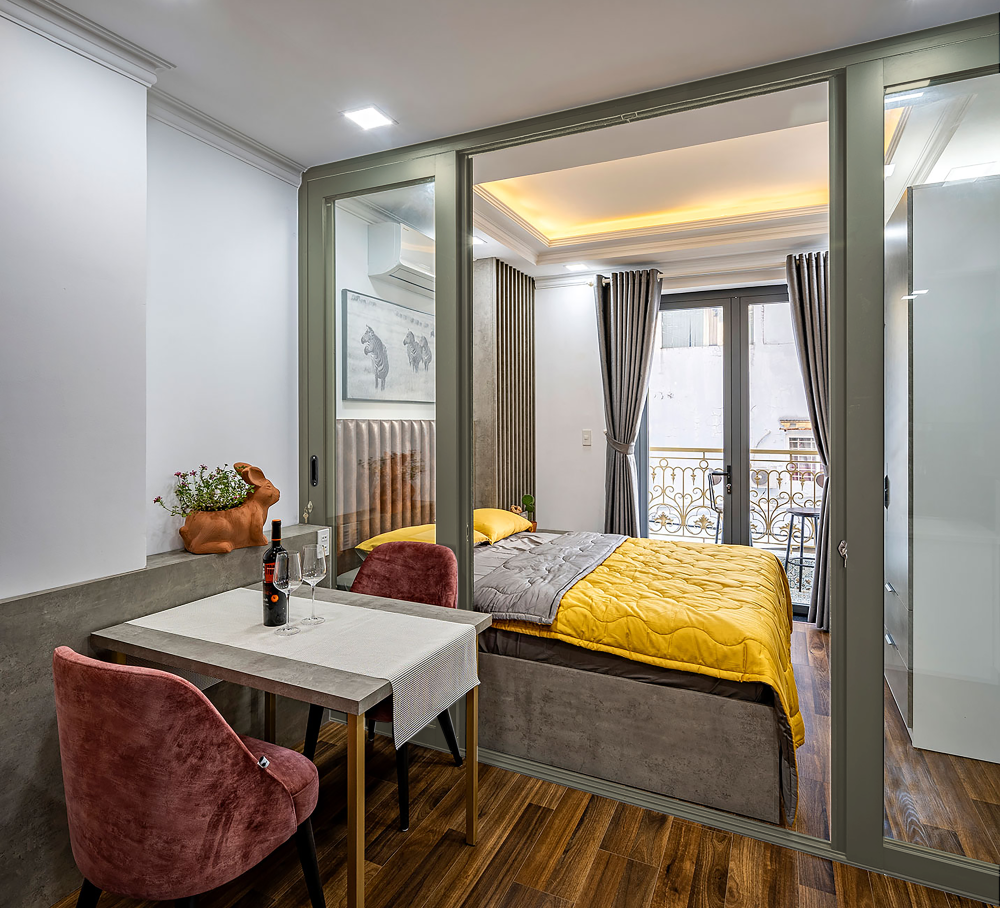 - Cửa có bản dày ôm trọn phần khung tường, tạo ra kiến trúc cửa, tường liền mạch, đảm bảo tính thẩm mỹ, độ chắc chắn, an toàn tối đa cho công trình sử dụng. Các chi tiết cánh sử dụng hệ nhôm 55 để hạn chế độ nặng của cửa.